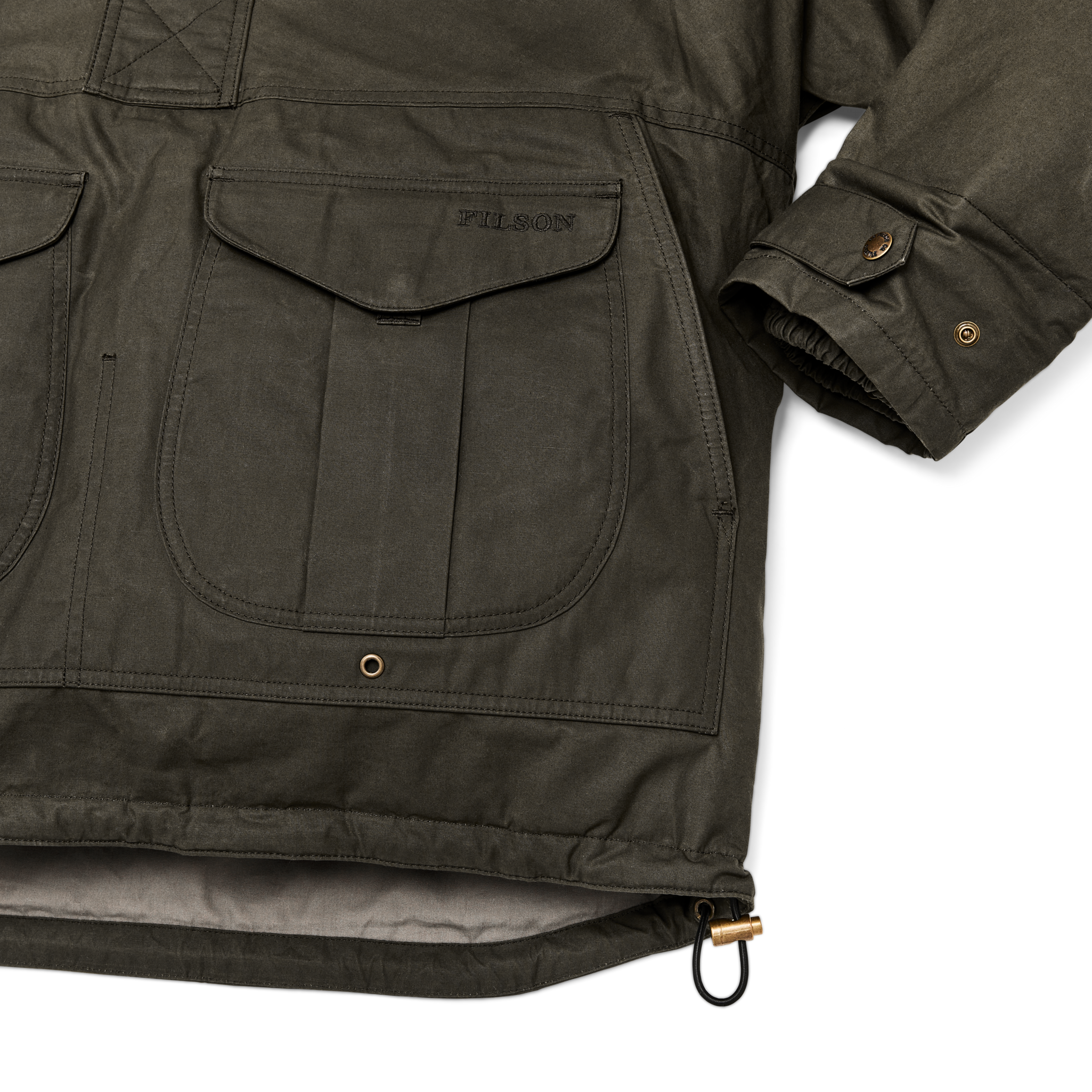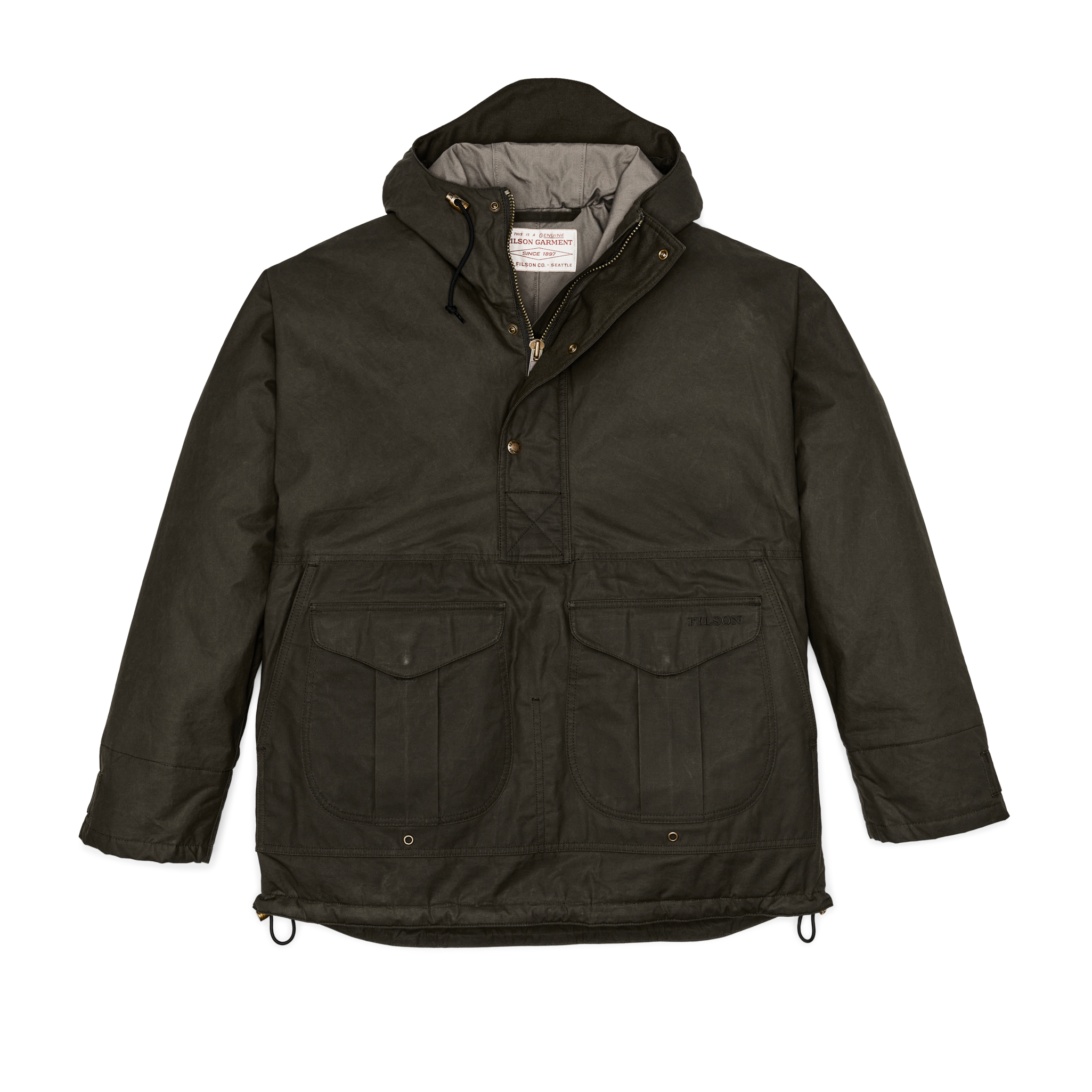 The Ranger fabric from England’s historic British Millerain is treated with a special dry-waxed finish that is water-resistant and washable. The insulation is PrimaLoft? Gold. a premium lightweight. compressible fill that retains 98% of its insulating ability when wet. PrimaLoft was developed when the U.S. Army required a light and warm alternative to goose down with superior wet-weather performance. The half-length front zipper is shielded by a snapped storm guard. A pass-through kangaroo pocket rides behind the front snap-flap cargo pockets. Drawcord-adjustable hood and hem. Classic Filson double cuffs with rib-knit interior and snap-tab adjustability of the exterior shell fabric.