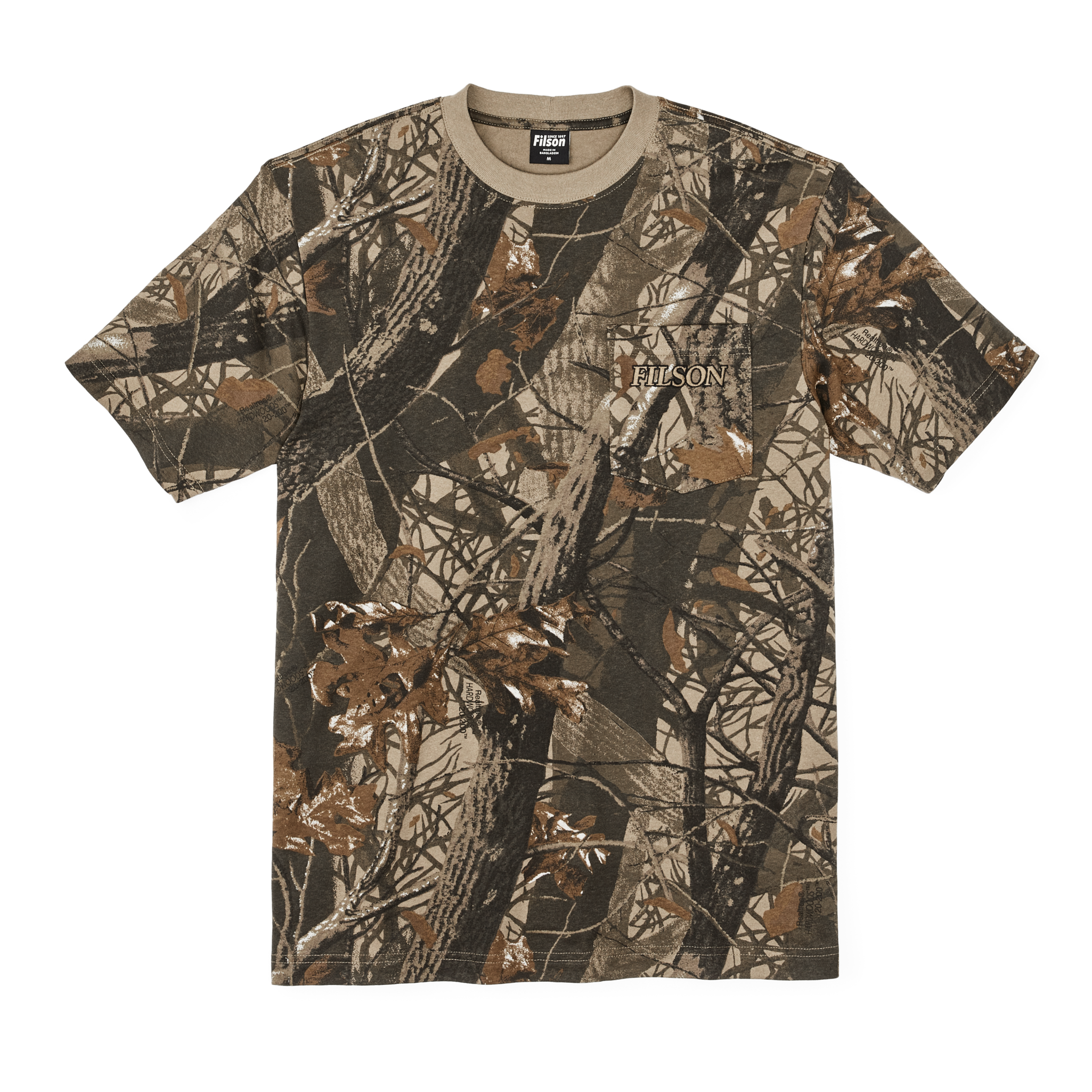 Our Embroidered Pocket T-Shirt is a heavy-duty take on a classic wardrobe staple. made with sturdy 6.5-oz. cotton that’s comfortable in any season. Printed with RealtreeĀ® Hardwoods??camouflage. Rib-knit collar for shape retention. Filson logo embroidered on left-chest pocket.